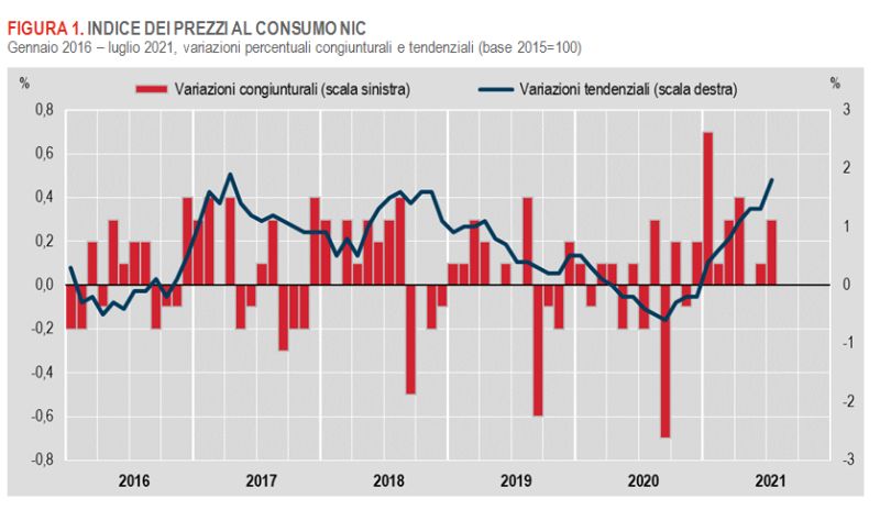 ROMA (ITALPRESS) – Secondo le stime preliminari dell’Istat, a luglio l’indice nazionale dei prezzi al consumo per l’intera collettività, al lordo dei tabacchi, registra un aumento dello 0,3% su base mensile e dell’1,8% su base annua (da +1,3% del mese precedente). Secondo l’Istituto la forte accelerazione dell’inflazione a luglio è di nuovo dovuta ai prezzi dei beni energetici, in particolare di quelli regolamentati, che registrano così la crescita più alta dal 1996, ossia da quando è disponibile la serie storica degli indici dei prezzi al consumo di questo aggregato (il valore più alto fu pari +16,2% a dicembre 2008). Seppur in misura contenuta, una maggiore vivacità dell’inflazione si manifesta però anche in altri comparti merceologici, determinando così una ripresa anche dell’inflazione di fondo che rimane comunque un terzo di quella generale. L’inflazione acquisita per il 2021 è pari a +1,5% per l’indice generale e a +0,8% per la componente di fondo.