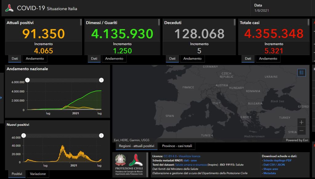 ROMA (ITALPRESS) – Cala il numero dei nuovi contagiati Covid in Italia: i nuovi casi sono 5.321, in discesa rispetto ai 6.513 registrati ieri; cala anche il numero di tamponi processati, solo 167.761. Il tasso di positività si impenna e passa dal 2,4% di ieri al 3,17%. Cala notevolmente il numero dei decessi, 5 le vittime mentre ieri erano state 16 (-11). I guariti sono 1.250, mentre gli attuali positivi arrivano a toccare quota 91.350 con un incremento di 4.065.