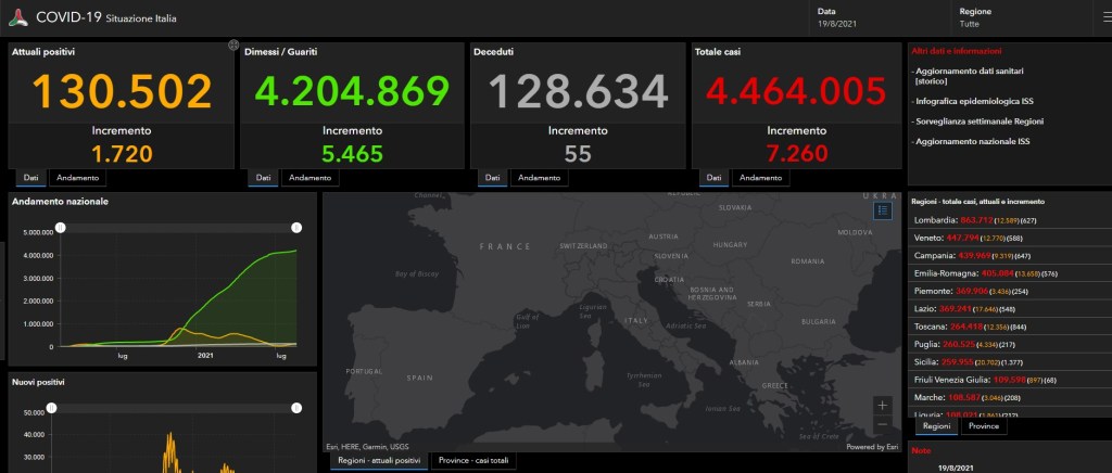 ROMA (ITALPRESS) – Sono 7.260 (7.162 nelle 24 ore precedenti) i nuovi casi di Covid e 55 i morti in 24 ore (ieri erano stati 69). Lo riferisce il ministero della Salute. Sono 206.531 i tamponi molecolari e antigenici per il coronavirus effettuati nelle ultime 24 ore in Italia. Il tasso di positività è del 3,5%. Gli attualmente positivi conteggiati in Italia sono 130.502 (+1.720 rispetto a ieri) e di questi 3.627 ricoverati con sintomi (+68) e 460 in terapia intensiva (+18) con 40 nuovi ingressi. Le persone sottoposte a isolamento domiciliare sono 126.415. Le regioni con il maggior numero di nuovi casi sono Sicilia (1.377), Toscana (844) e Campania (647). Quelle con l’incremento minore sono Valle d’Aosta (11) e Molise (12).