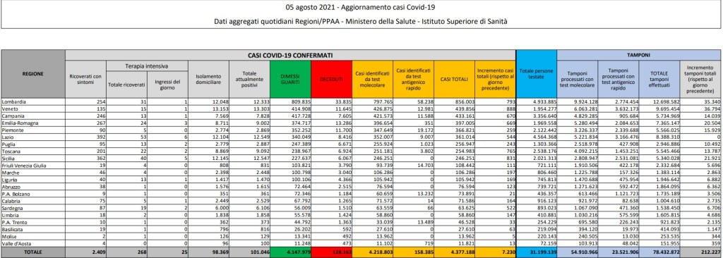 ROMA (ITALPRESS) – Crescono i casi di Covid in Italia. Secondo i dati del ministero della Salute, i nuovi positivi sono 7.230 rispetto ai 6.596 di ieri. I tamponi processati sono 212.227 (ieri erano stati 215.748) determinando un tasso di positività in leggero aumento al 3,40%. Sono 27 i decessi (ieri 21), 3.371 i guariti mentre gli attualmente positivi salgono di 3.826 unità attestandosi su un numero complessivo pari 101.046. I ricoverati con sintomi sono 2.409 (+100), mentre i pazienti in terapia intensiva sono 268, con 25 nuovi ingressi nelle ultime 24 ore. La regione che registra il maggior numero di nuovi casi e’ il Veneto con 888, seguito da Sicilia con 831 e Lombardia con 793. La Regione con il minor incremento di contagiati e’ il Molise (5) seguita da Valle d’Aosta (13) e Provincia autonoma di Bolzano (21).
