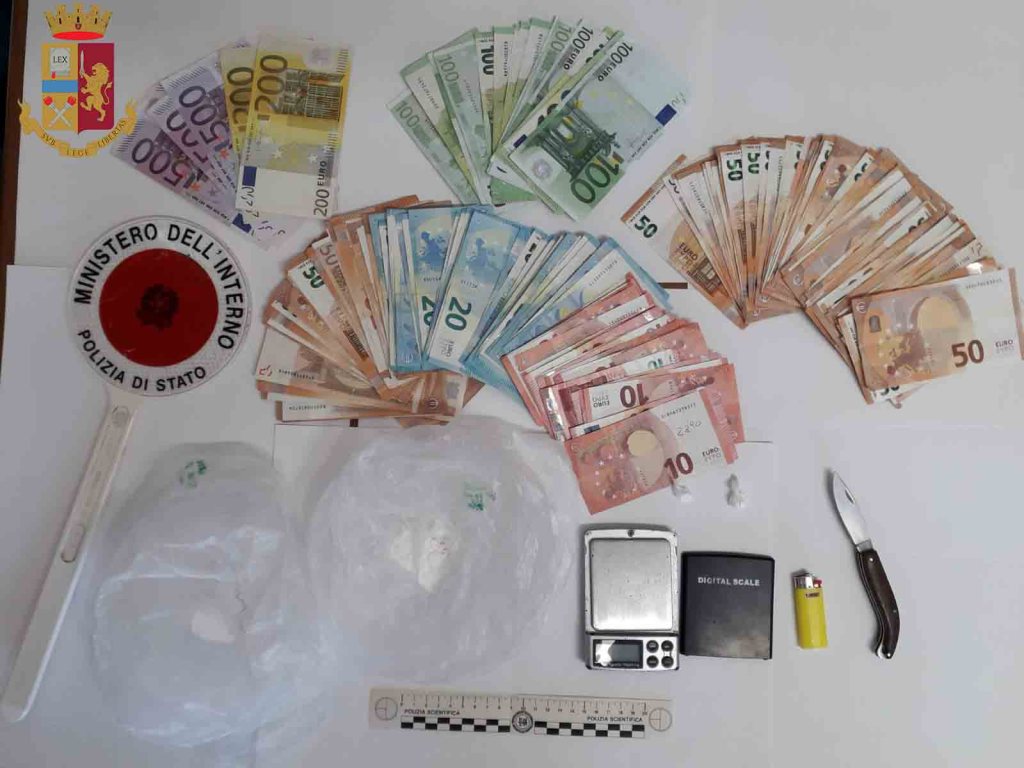 Nel momento dell’irruzione, il sessantunenne tenta una precipitosa fuga, ma viene raggiunto e bloccato, nel vicolo adiacente all’abitazione. La successiva perquisizione domiciliare ha permesso di rinvenire e sequestrare sul tavolo della sala da pranzo 22 grammi di cocaina, 32 grammi di sostanza da taglio, un bilancino, un accendino, un coltello e materiale per il confezionamento in dosi.Rinvenuta e sequestrata, inoltre, la somma di denaro pari a 8.990 euro ritenuta provento dell’attività illecita.