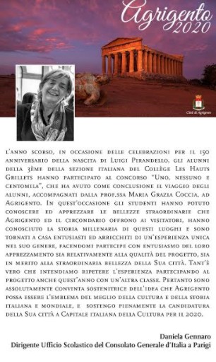 “Sono convinta sostenitrice dell’idea che Agrigento possa essere l’emblema del meglio della Cultura e della Storia italiana e mondiale”. Così scrive, in un suo endorsement , inviato al sindaco di Agrigento, Lillo Firetto, Daniela Gennaro, Dirigente dell’Ufficio scolastico del Consolato Generale d’Italia a Parigi, a proposito della candidatura della città dei templi a “Capitale italiana […]