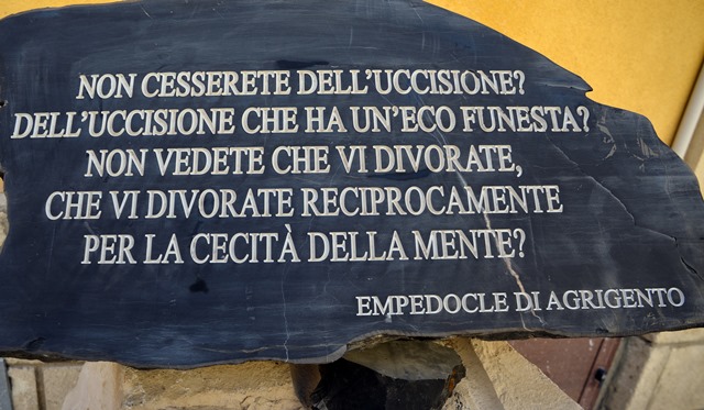 Proprio così, Silvio Benedetto ha segnato fortemente la mia vicenda di spettatore e un giorno o l’altro dovrò decidermi a tirare fuori gli scatti e regalargli una mostra. Oggi Benedetto è stato chiamato ad illustrare il pensiero di Empedocle attraverso un unico percorso illustrativo dove l’artista deve evocare la grecità implicita nella storia della città di Agrigento rappresentando le origini culturali e storiche attraverso un linguaggio contemporaneo. L’artista ha previsto la collocazione di quattro massi a visione multipla volutamente grezzi ai lati e nell’interno per valorizzare la bellezza della pietra e recanti sulle rispettive facce esterne inserimenti artistici di esecuzione polimaterica raffiguranti il pensiero di Empedocle, (i quattro elementi, il binomio amore-odio, il mito) il tutto con uno sguardo attento all’identità siciliana.