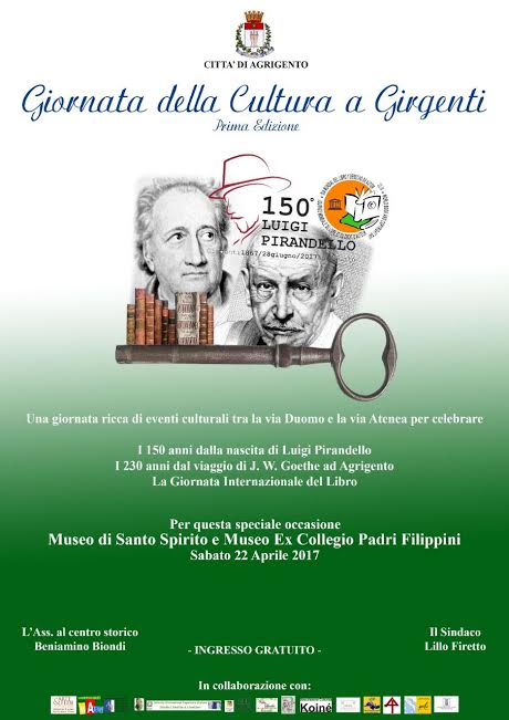 Domani la prima edizione della “Giornata della cultura a Girgenti” organizzata dal Comune insieme ad altri enti, associazioni e privati (Distretto Turistico Valle dei Templi, Soprintendenza ai Beni Culturali, Casa Museo e Biblioteca Pirandello, Biblioteca Lucchesiana, Mudia, Arte&Fede, Officine Mas, Circolo Empedocleo, Libreria Il mercante di libri, b&b Villa Goethe, ass. Koinè, Istituto Magistrale “Saetta […]