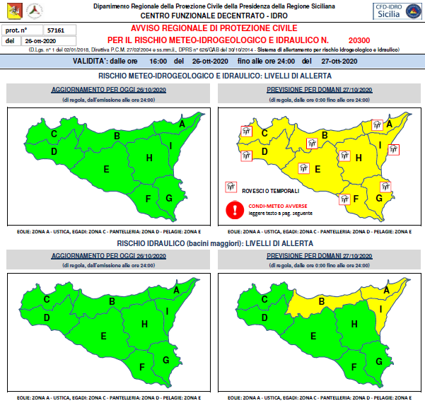 Il Dipartimento Regionale della Protezione Civile della Presidenza della Regione Siciliana ha diffuso un avviso per il rischio meteo-idrogeologico ed idraulico, valido fino alle 24 di domani. Il livello di allerta e’ di colore giallo. Lo rende noto il comune di Agrigento. In particolare, “dalle prime ore di domani, e per le successive 24-36 ore, si prevedono precipitazioni, a prevalente carattere di rovescio o temporale. I fenomeni saranno accompagnati da rovesci di forte intensita’, frequente attivita’ elettrica, locali grandinate e forti raffiche di vento.