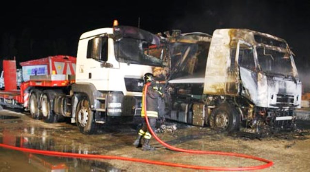Incendiati ieri a tarda sera cinque camion di proprietà di un’azienda di autotrasporti di Vittoria. Si tratta della Gatto Autotrasporti, da anni lavora nel settore del trasporto degli ortaggi. Sul posto i vigili del fuoco per spegnere le fiamme e la Polizia per i primi accertamenti.