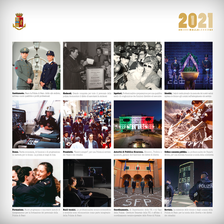 Le 12 immagini del calendario, scattate da vari fotografi e in epoche diverse, sintetizzano i 40 anni di storia iniziata nel 1981, anno della legge numero 121 che ha riconosciuto nella Polizia di Stato la prima forza di polizia civile ad ordinamento speciale e delineato il sistema della Pubblica Sicurezza in Italia.