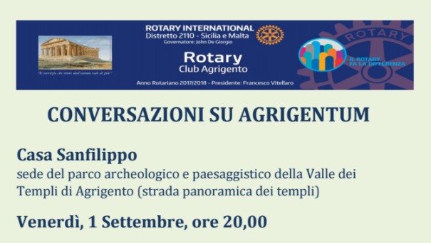 Domani, 1 settembre, alle ore 20.00, presso la sede del Parco Archeologico della Valle dei Templi di Agrigento (sulla strada panoramica), a Casa Sanfilippo, si terrà un incontro, organizzato dal Rotary International Club di Agrigento. La manifestazione “Conversazioni su Agrigento” vedrà la partecipazione di Valentina Caminneci, Maria Concetta Parello e Maria Serena Rizzo, con conclusioni […]