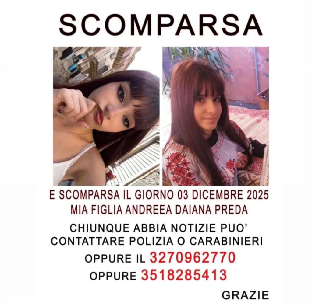 «È uscita ieri tra le 11,30 e le 12 e non è più tornata. Aiutateci a trovarla». Da questa mattina in città gira un appello per ritrovare Andreea Daiana Preda, 15 anni, studentessa dell’istituto Turrisi Colonna. L’appello viene direttamente dalla madre. «Noi abitiamo nei pressi dell’incrocio con via Garibaldi di via Plebiscito, era vestita con una giacca nera, pantaloni grigio chiaro e scarpe bianche della Nike», riferisce.