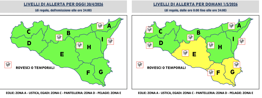 La protezione civile regionale ha diramato un’allerta meteo gialla a partire dal 30 aprile fino a tutta la giornata successiva