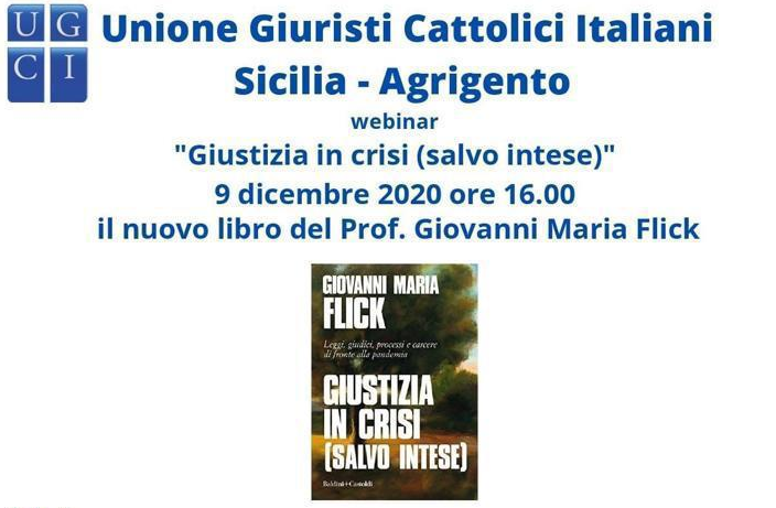 L’unione giuristi cattolici italiani Sicilia sezione di Agrigento ha organizzato un seminario via web per giorno 9 dicembre a partire dalle ore 16 per parlare di “Giustizia in crisi (salvo intese)”, il nuovo libro del Prof. Giovanni Maria Flick, che racconta come dietro ogni legge ci siano i rischi del dogmatismo, dell’autoritarismo e della staticità, appena nascosti dall’utopia dell’uniformità, dell’uguaglianza e della saggezza di una norma nata dal confronto delle parti.