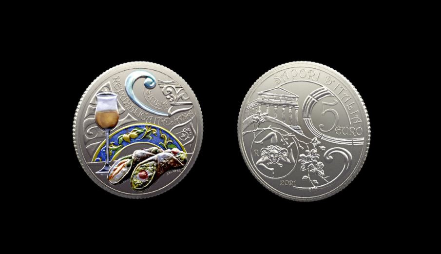 Nella moneta vengono riprodotti il cannolo siciliano, il passito e il Tempio della Concordia della Valle dei Templi