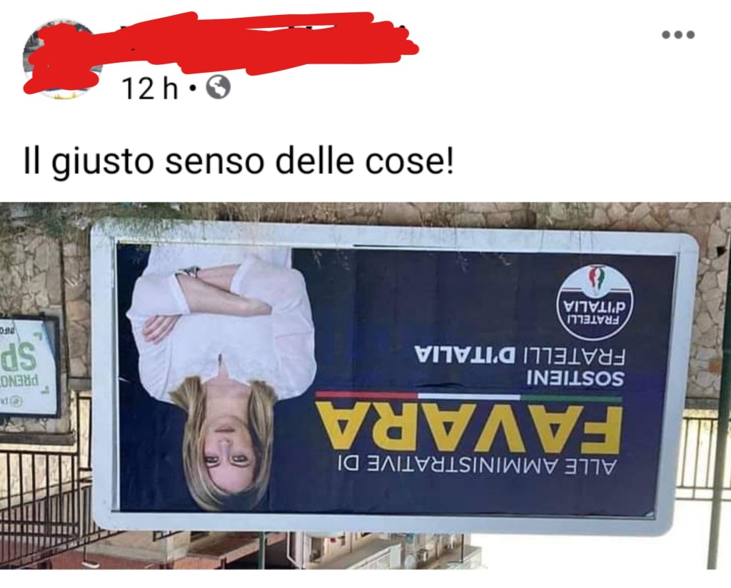 Manifesti elettorali della Meloni a testa in giù tra indignazioni e solidarietà