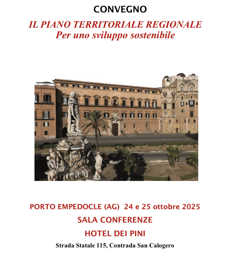 Si terrà domani, venerdì 24 ottobre, dalle 16.00, presso l’Hotel dei Pini di Porto Empedocle il convegno dal titolo “Il Piano territoriale regionale – per uno sviluppo sostenibile”, promosso dall’associazione degli ex deputati dell’Assemblea regionale siciliana. I lavori saranno aperti dal presidente Rino La Placa. Tra i relatori, Rosanna Giordano, dirigente dell’Assessorato regionale all’Ambiente e Ferdinando Trapani, docente di Urbanistica presso l’Università di Palermo. Previsti due interventi di Giacomo Mulè, docente di Sociologia all’Università UniKore di Enna, sui 60 anni dalla frana di Agrigento e di Manlio Mele, già deputato regionale, sulla Pianificazione paesaggistica in Sicilia. Il convegno avrà anche una seconda giornata di lavori, sabato 25 ottobre, con una Tavola rotonda, dalle ore 9,00, alla quale prenderanno parte Franco Piro, vice presidente dell’Associazione ex deputati Ars, i parlamentari regionali Giorgio Assenza, componente della commissione Bilancio Ars, Nello Di Pasquale e Bernadette Grasso componenti della commissione Ambiente Ars e Giampiero Trizzino, già presidente della medesima commissione parlamentare.
